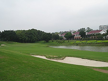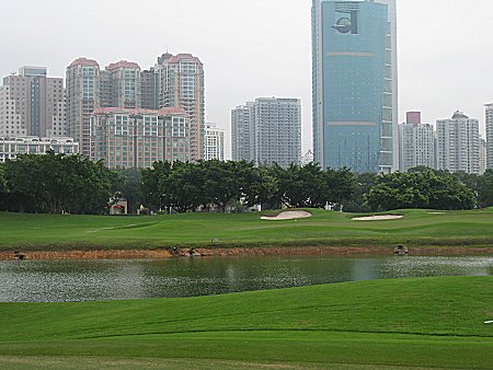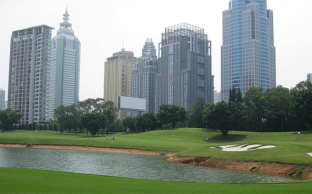シンセンのコースの中ではトップクラス。手入れも抜群だし、デザインも面白い。青木デザインは始めてだったもんで、興味あったが、なかなかチャレンジング。けして狭いとは思わなかったが、ヤなところに川、池があったり簡単ではない。でも、深圳市内のド真中にあり、香港からすごく近いし、中華もおいしい。 朝食のザーサイ麺がお薦めです。 (5/2001) 9年ぶりにプレーし、なんとなく改造された気がする。確認できず。それよりびっくりしたのは、周りの高層ビルの数がすごく増え、ゴルフ場が深圳の街中の公園なのじゃないかぐらい中心にあることが良くわかる(下記参照)。メンテは良かったがクリーンが重かった。ちょっと残念。クラブハウスはドーンとロビーが贅沢に広く、全体の内装は大理石。B コースはプレーした日閉鎖中。プレー中にBコースのグリーンを掘っていたが見えるため、しばらく閉鎖なのでは。 (4/2010)