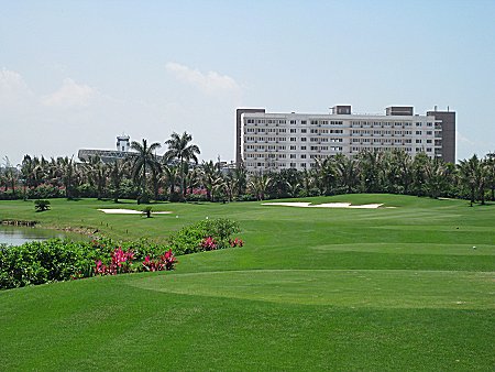 名前の通り、深圳空港のとなりにあるゴルフ場。飛行場のとなりにあるため、平べったく、丘一つも無い。その代り、池がいっぱい。一番から早速池を巻左ドッグ。目の前に飛行場のターミナルビルしか見えなく、また、飛行機がうるさい。この飛行機も中国の国内線なんで、分けわからない航空会社ばっかりで、ちょっと変。 クラブハウスはまだ半分しか出来てなかったが、必要最低限の施設はあった。現在はもう完成しているだろう。食事も相変わらず中華が中心であったが、そこそこいけます。その他の施設について、打ちっぱなしが天然芝であることが評価できる。 香港からはフェリー。フェリーフェリーターミナルからバスで五分なので、便利。コースもまだ新しかったので、きれいな印象なので、とりあえずはお薦めのコースです。 (9/2001) 10年後に久しぶりにプレー。コースのヤシの木も大きくなり、10年前にラフに打ち込んでも簡単に出たイメージが今は全然。空港ターミナルも今はそう簡単に見えない。確かに水が多いコースには変わらない。離着陸する飛行機も相変わらずうるさい。10年前と比べ、深圳もメジャーな大都会になったため、なおさら空港の離着陸が増えた感じ。ちょっと残念だったのは、フェアウェーの芝が気持ち長く感じ、また、グリーンも重い。まぁ、実質パブリックコースだからしょうがない。メンテはそれなりで、見た目きれいなコース。 半分しかできていないクラブハウスは今となって、外見ちょっと修理が必要な感じ。食堂、ロッカールーム、プロショップはしっかりしているため、必要最低限の設備はある。食堂は手打ちうどんもあり、中国コースでは当たり前ではあるが、旨い。 フェリーでも行けるが、現在深圳湾の橋ができ、車、バスで簡単にいける。 (5/2011)