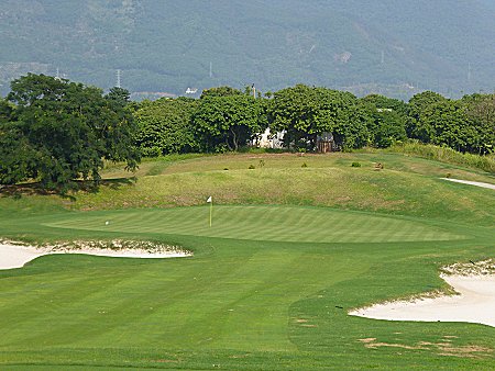比較的広いグリーンを狙うショート。左右にバンカーがあるので注意。
